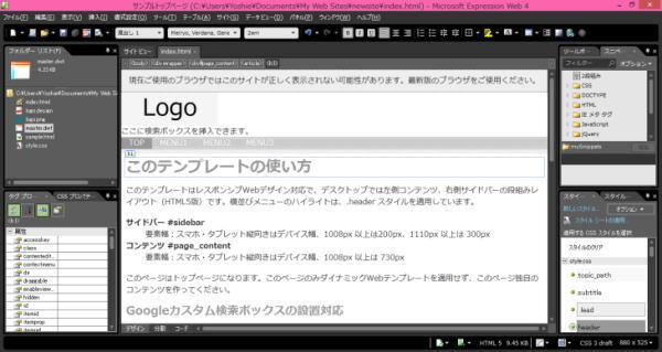 「Microsoft Expression Web 4」の基本的な機能ですが、起動すると、中央が編集領域の画面が表示されます。上下左右には各種機能を利用するためのツールバー、パネルが配置されています。中央の編集領域は、デフォルトではワープロのような「見たまま状態」(WYSIWYG)で編集してゆく「デザイン」モードになっています。
